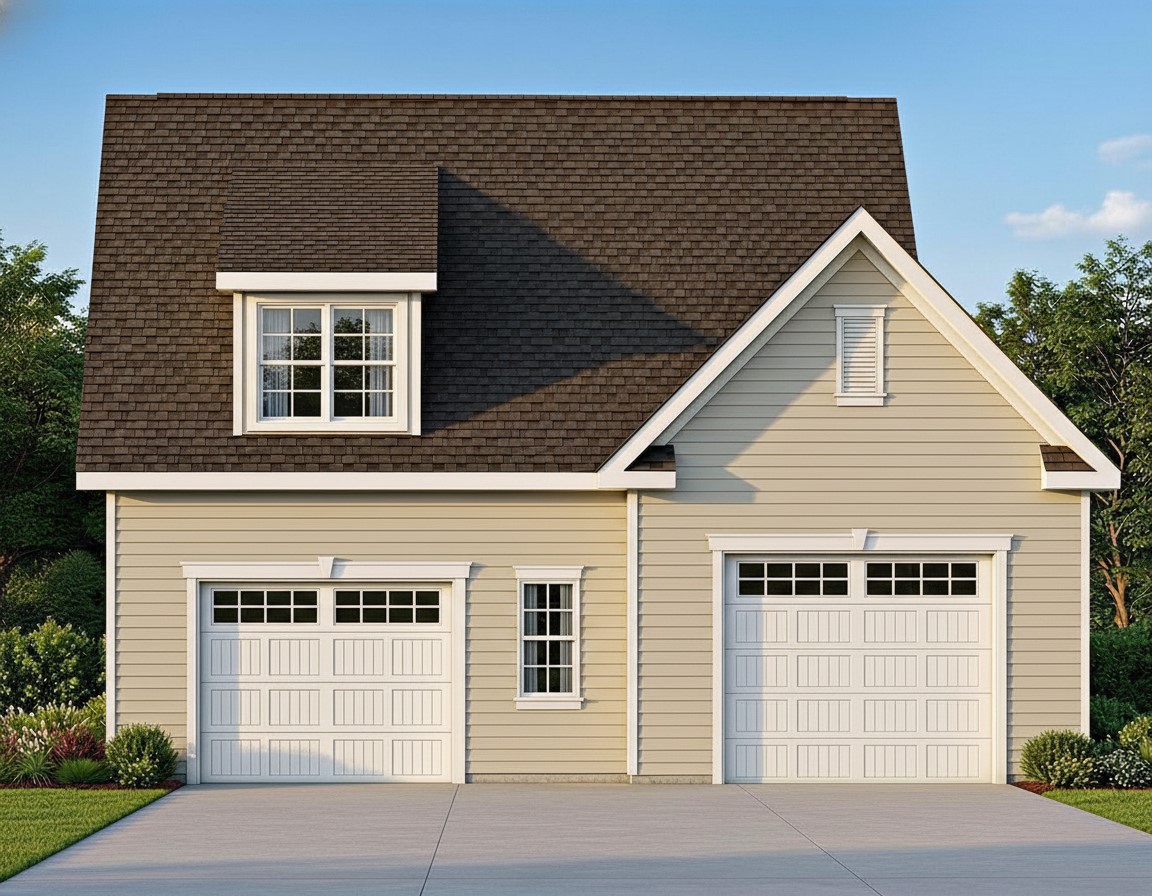 This cleverly designed two-car garage has loft storage over one bay and the taller bay on the other side has a ceiling tall enough for an auto lift. The taller walls are 10 feet tall and framed with 2×6 studs. The ceiling slopes up from each side and levels off at 12 feet.