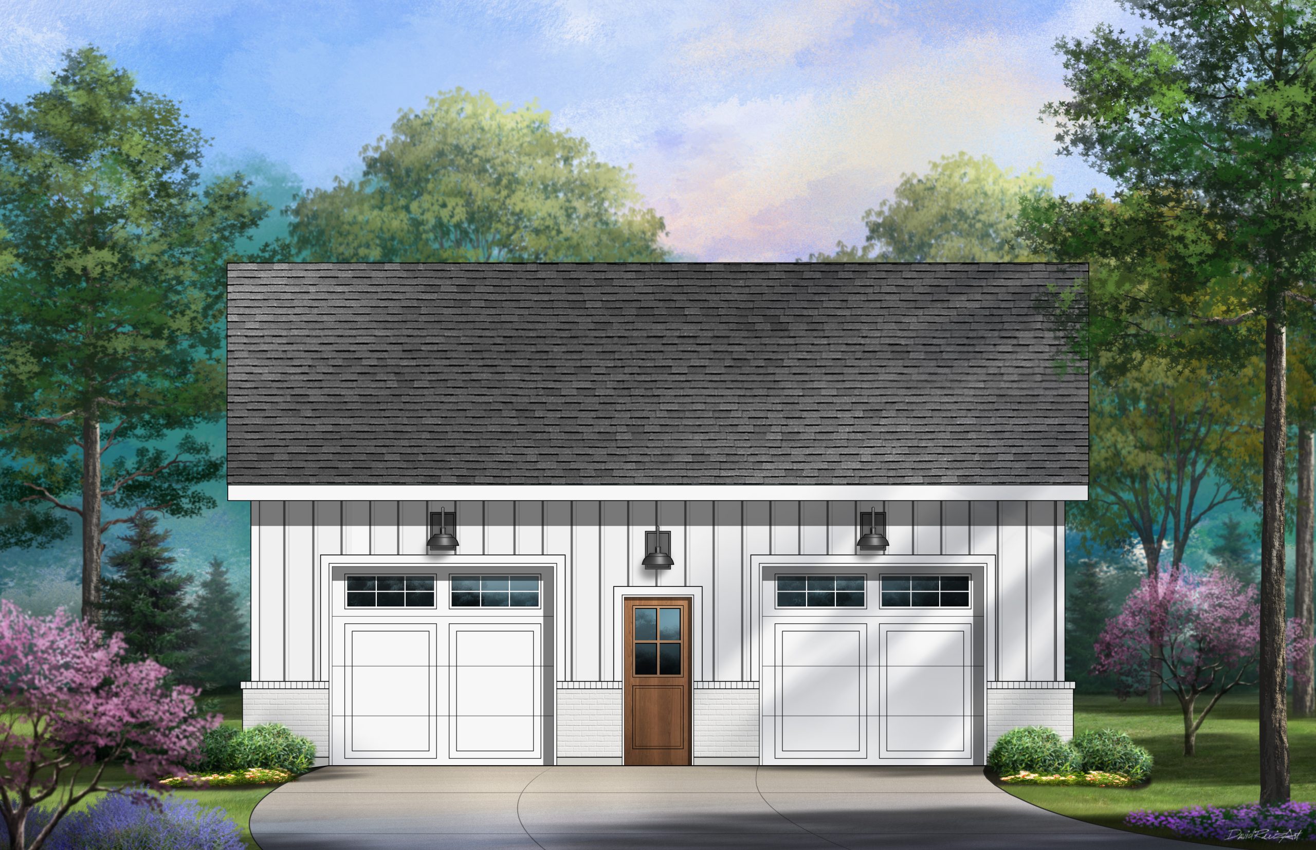 This two-car garage plan can accommodate an auto lift in one bay by using 10’ tall walls and a vaulted ceiling. This allows for a 12-foot interior ceiling while keeping the overall building height as low as possible in the event of any building height restrictions.